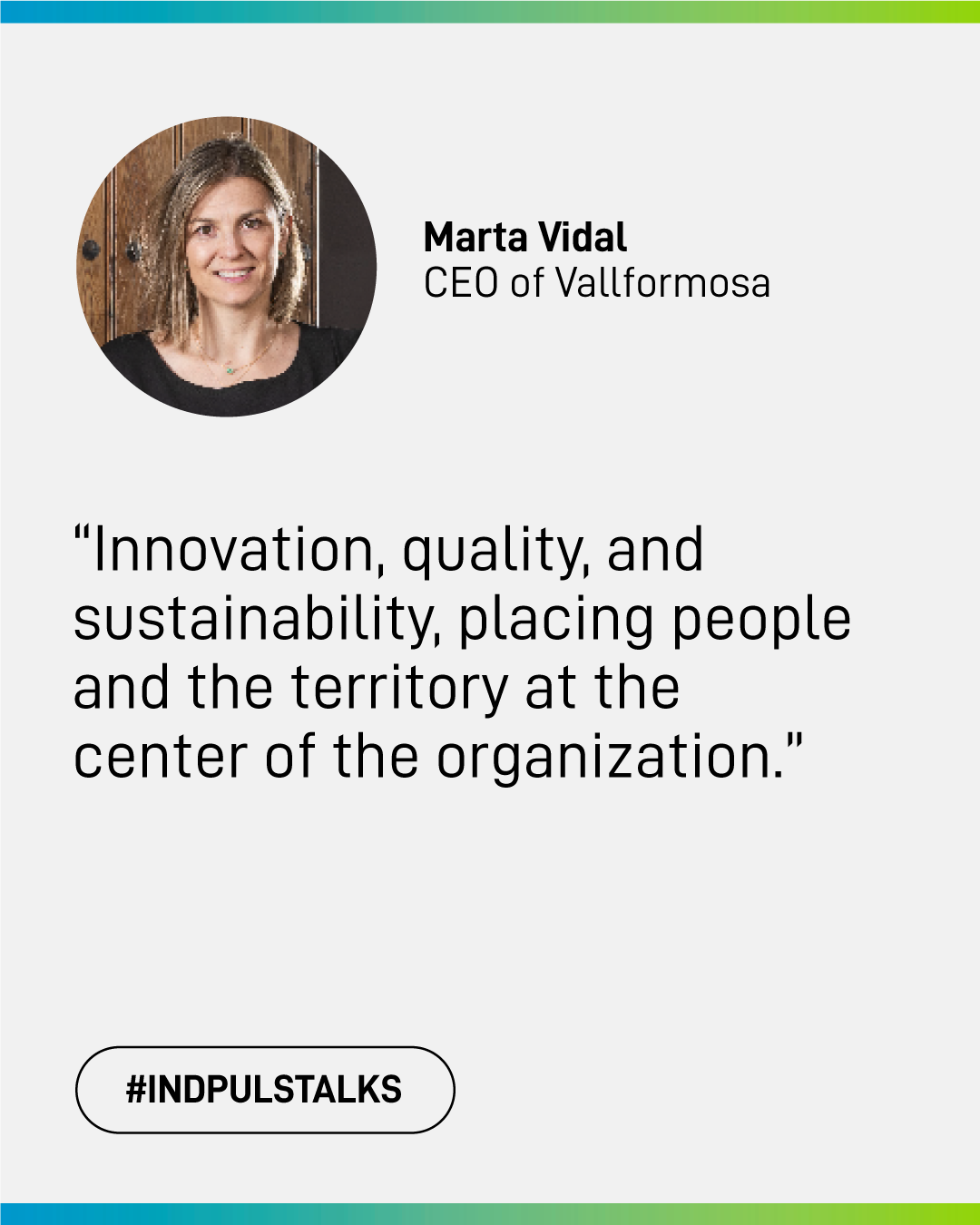 Under her leadership, Vallformosa, an industrial company and member of INDPULS, has embraced values such as innovation, quality, and sustainability, placing people and the territory at the center of the organization.